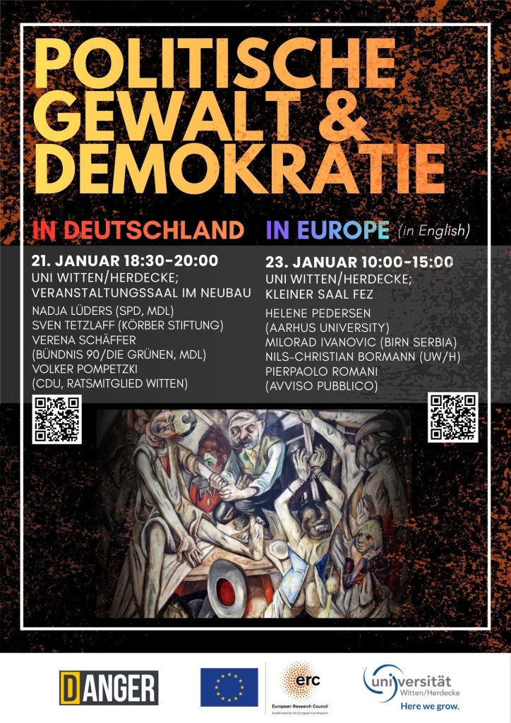 Im Fokus der Workshops stehen Dynamiken politisch motivierter und extremistischer Gewalt sowie deren Auswirkungen auf demokratische Politik. Aufbauend auf empirischen Befunden aus dem DANGER-Projekt bringen die Veranstaltungen Wissenschaftler:innen, politische Entscheidungsträger:innen und Praktiker:innen zusammen, um Perspektiven auf politische Gewalt in Deutschland und Europa auszutauschen.