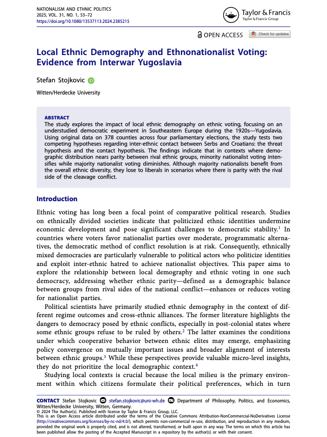 Stojkovic, S. (2024). Local Ethnic Demography and Ethnonationalist Voting: Evidence from Interwar Yugoslavia. Nationalism and Ethnic Politics, 31(1), 53–72. https://doi.org/10.1080/13537113.2024.2385215
